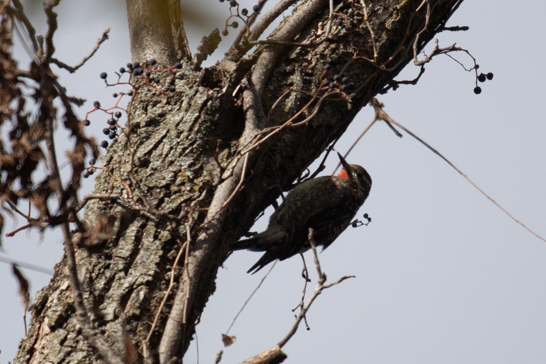 Whoever named the North American woodpeckers was a mad genius. That bird has a distinctive red cap and light belly? Red-bellied. That bird over there sometimes has a red patch on its head and sometimes on its throat? Yellow-bellied Sapsucker. I’ve seen these a few times and have yet to see any yellow. Maybe the original discoverer thought they were cowardly in an old-west type way.